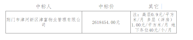 鳳凰小區(qū)前期物業(yè)服務(wù)于2017.04.28在荊門市公共資源交易網(wǎng)上發(fā)布了中標(biāo)候選人公示,公示期為2017.04.28至2017.05.03?,F(xiàn)對本次招標(biāo)的中標(biāo)結(jié)果公告如下: